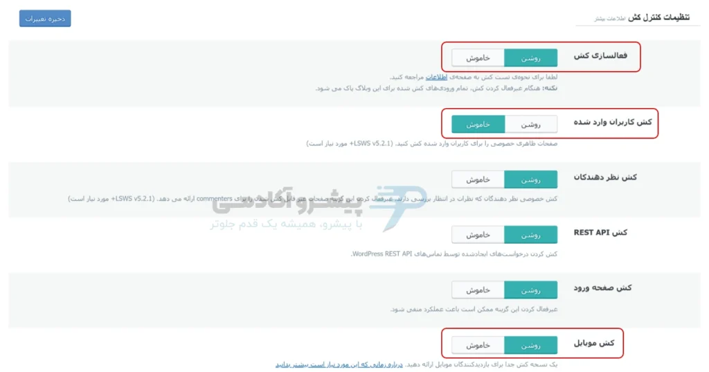 - Cache Logged-in Users: معمولاً OFF مگر سایت عضویت/لرنینگ دارید.